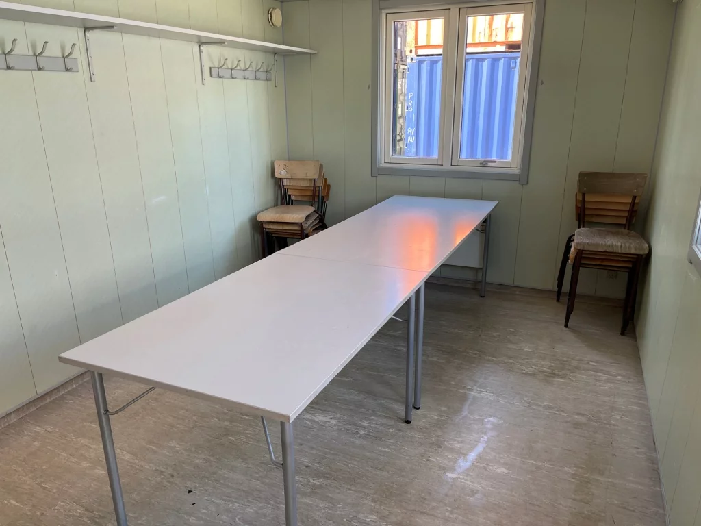 Skurvogn med toilet, bad, omklædning, mini køkken, borde og stole til 10 mand